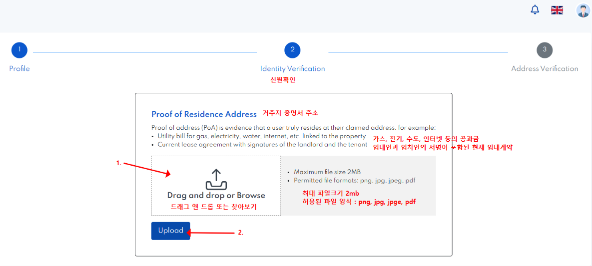 표시해드린 1번 부분을 클릭 후에 공과금 내역서에 나온 주소지를 사진 찍어서 업로드를 하면 됩니다.