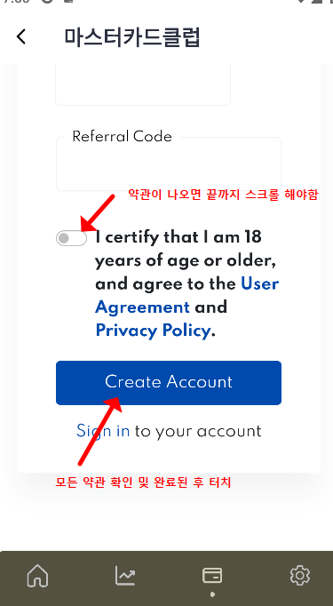 그 후, 약관 동의란에 체크하는 과정이 있습니다. 스크롤을 끝까지 내리고 동의를 누르면 파란 스위치가 켜지며, 가입을 완료할 수 있는 [Create Account] 버튼이 활성화됩니다.
