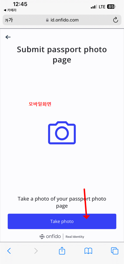 모바일로 접속한 후에는 아래 캡쳐사진과 같이 여권 사진을 촬영하고 업로드하게 됩니다.